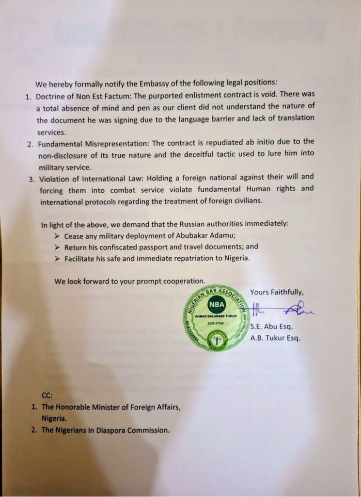“How did Abubakar obtain the visa? How did he end up in the Russian uniform? Who pays his salary as a Russian soldier?” Barrister Suleiman asked.