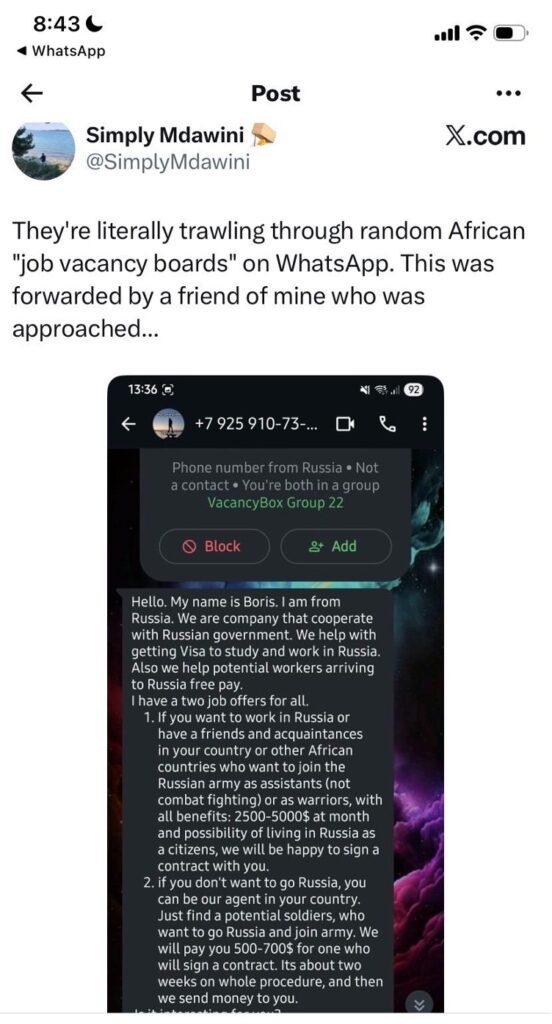 According to the French Institute of International Relations, at least 3 000 Africans are among the foreign fighters serving in the Russian army. The number might increase as recruitment agents continue to advertise job opportunities in Russia through multiple social media platforms. A recruiter named, Boris, is reportedly trolling people on Telegram and WhatsApp and persuading them to apply for government jobs or recommend interested applicants.
