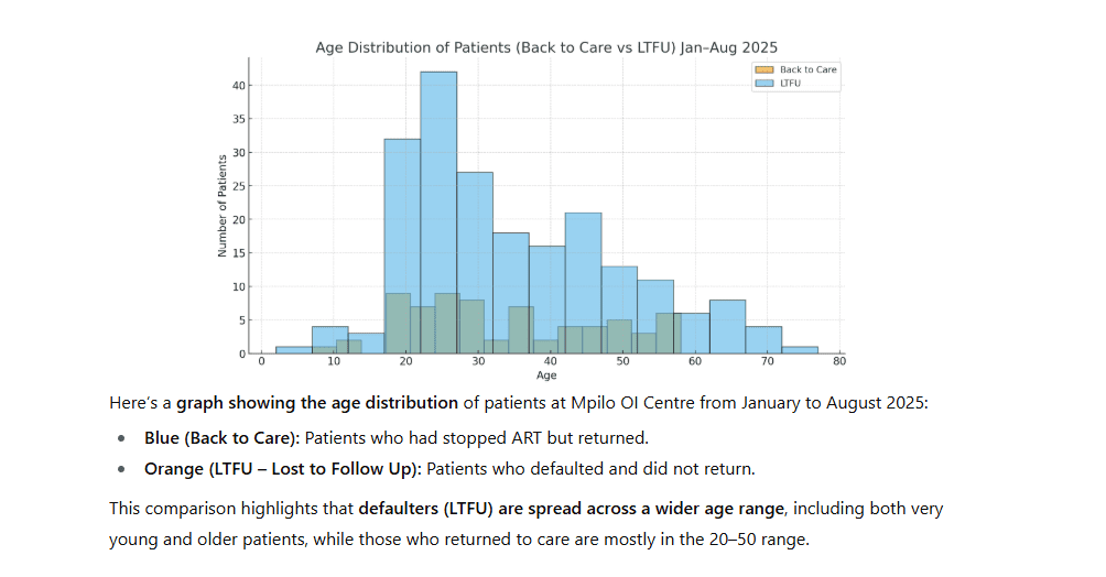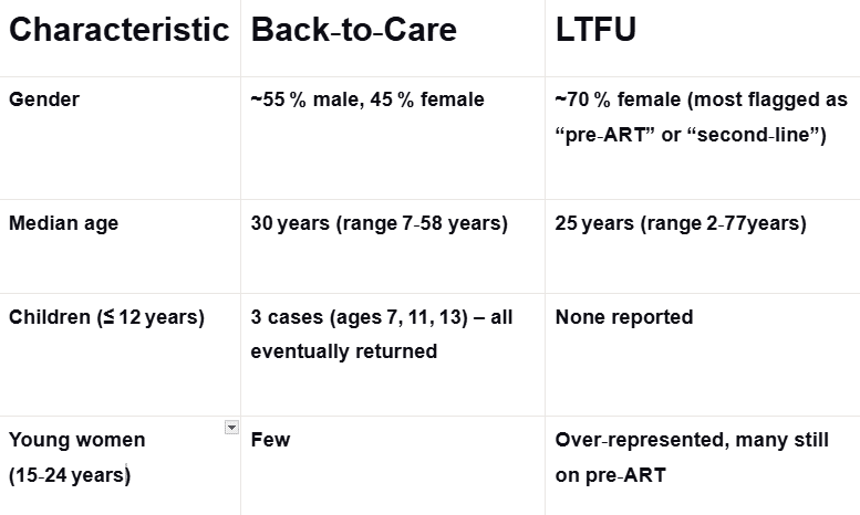 Young women dominate the LTFU pool, reflecting socioeconomic pressures, including transport costs, childcare duties and the need to earn a living, which pull them away from consistent clinic visits.