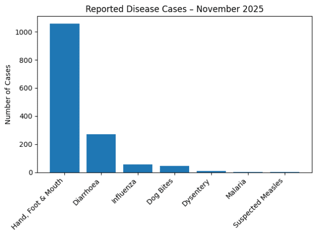 The report highlighted fluctuations in other communicable diseases. Diarrhoea cases reached 269 in November, while influenza infections rose sharply from 22 cases in October to 54 in November 2025.