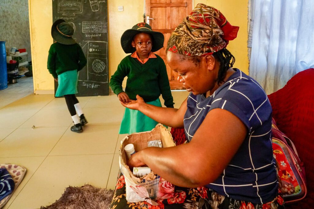Eneles Zhou gives her daughters, Pinky and Partner Sibanda, their morning medication. Daily doses of folic acid and hydroxyurea are essential in managing their sickle cell disease.