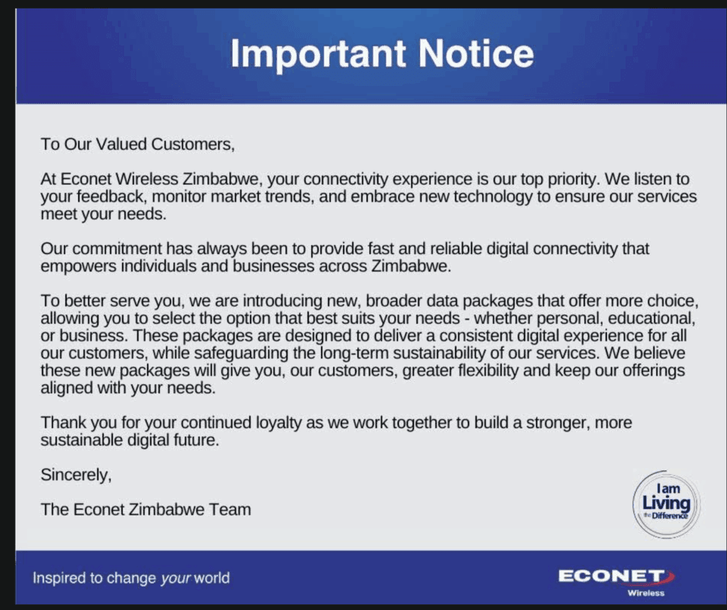 “At Econet Wireless Zimbabwe, your connectivity experience is our top priority,” the company said in a notice to customers.