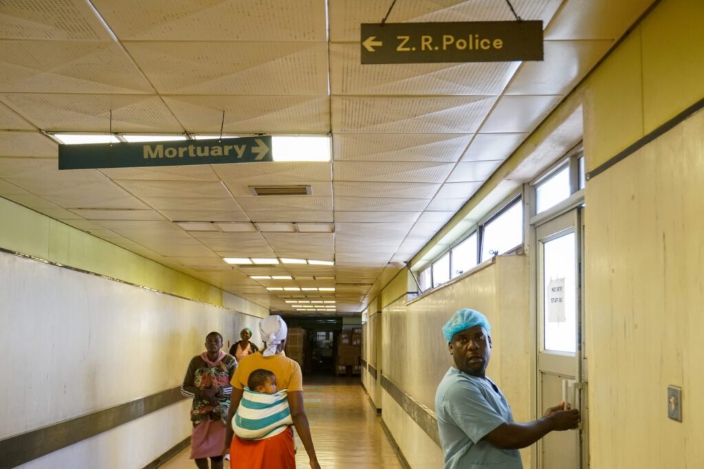 A hospital corridor leads to the mortuary at Parirenyatwa Hospital. Zimbabwe’s public health system faces a severe shortage of pathologists, leading to postmortem delays and widespread bribery. Families say they’re often pressured to pay unofficial fees to expedite the process or obtain basic information about their loved ones.