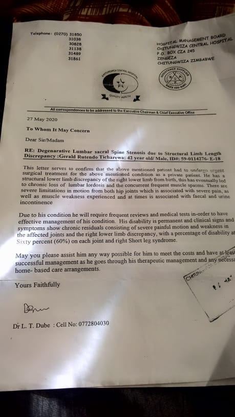 A 42-year-old man from Chitungwiza, Gerald Rutendo Ticharewa is appealing for financial assistance to undergo a spine realignment and lumbar decompression surgery.