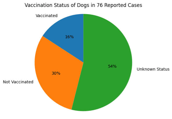 Of the 76 cases, only 12 dogs were vaccinated, 23 were not vaccinated, while 41 had an unknown vaccination status, raising concerns about compliance with pet vaccination requirements.