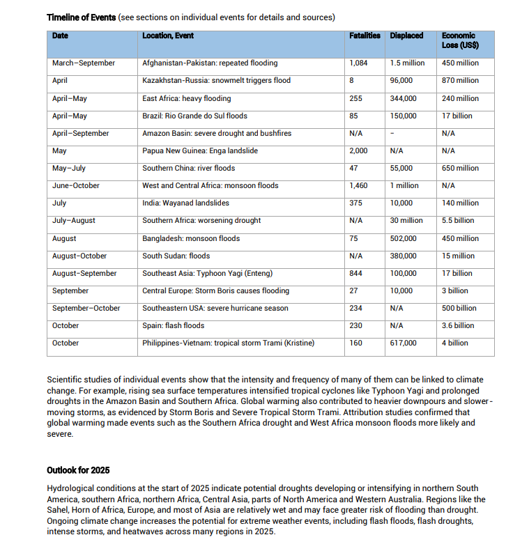 The report highlights how climate change is driving more frequent and intense extreme weather events, such as flash floods, flash droughts, storms, and heatwaves, projected to disrupt regions globally in 2025.