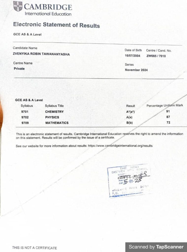 Despite not attending formal classes, he achieved 14 points, Chemistry A*, Physics A, and Pure Mathematics B, the highest among candidates at the college, according to Zvenyika.
