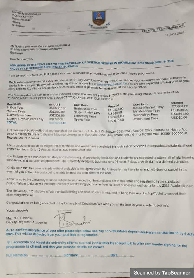 His efforts earned him a place in the competitive medical programme at the University of Zimbabwe. However, the cost remains out of reach. Tuition fees are set at US$742, while on-campus accommodation costs US$780. Off-campus options cost around US$130 per month.