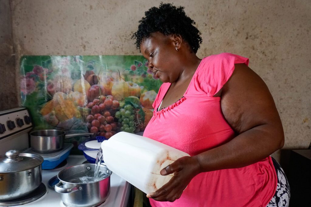 Junior Buta pours water into a pot for cooking at her home. She boils it for several minutes to kill germs, fearing contamination from the municipal water supply.