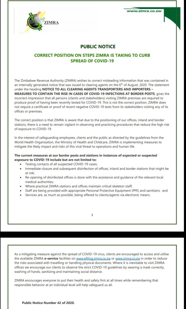 “ALL persons entering the ZIMRA areas specified herein that is border posts, transit sheds, container depots, bonded warehouses, airports, aerodromes and airstrips, postal sorting offices, state warehouses, administration and cash offices, satellite offices, and any other service delivery point, inland or at any border post will be required to have been tested for Covid-19 and to provide such proof as it is verifiable to the effect that such tests have been carried out and the individual is free of the infection,” ZIMRA had said in its initial notice to clearing agents, transporters and importers.